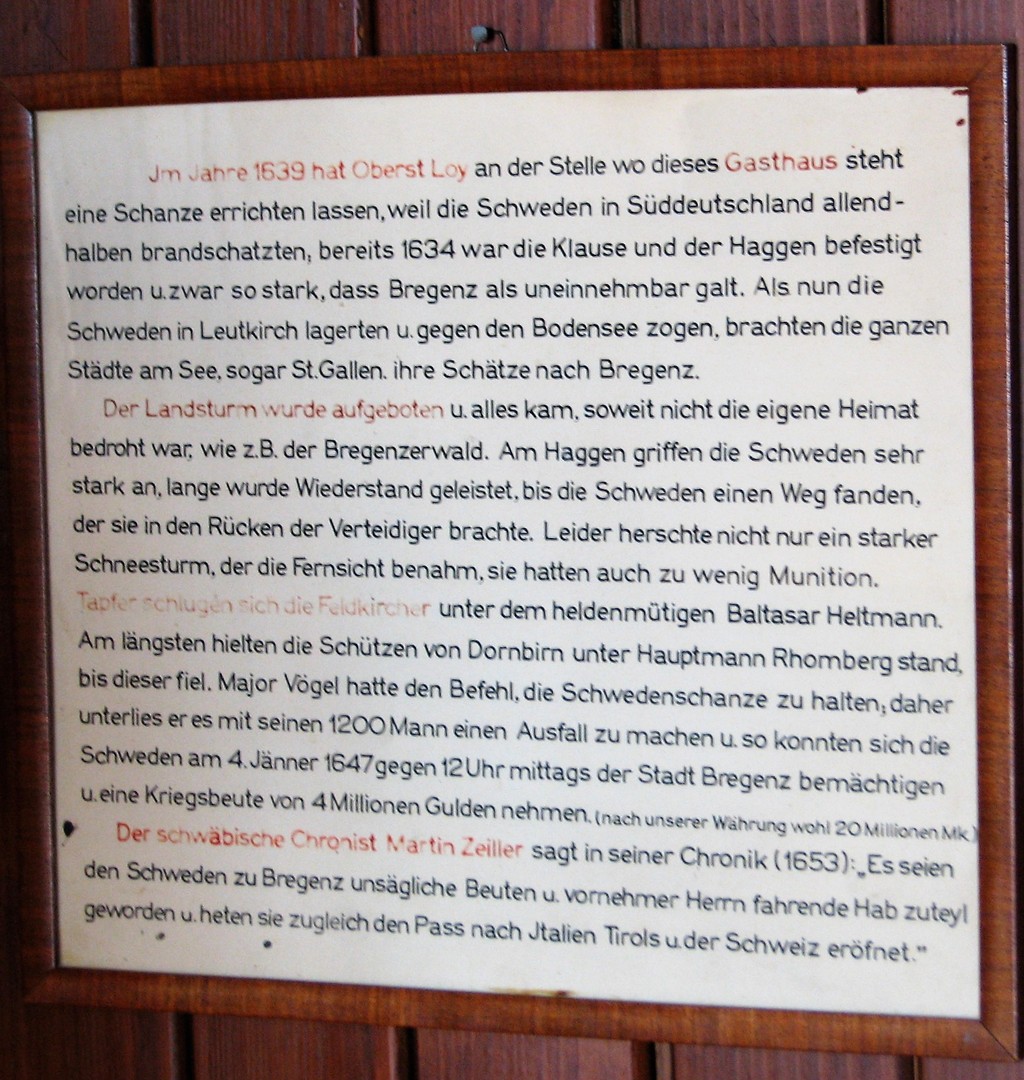 Lindaun kaupunki on pieni, sievä ja mielenkiintoinen. Kävin Lindaussa keväällä, kun lumet olivat juuri lähteneet. Bodenjärven rannat olivat vielä täynnä alppivirtojen tuomaa luonnonmateriaalia; alhaalla kaupungissa kukoistivat jo kukkaset, mutta vähän ylempänä Fender-vuorella oli vielä paljon lunta ja fantastiset näköalat järvelle ja Lindaun saarelle, jossa sijaitsee lähinnä kaupungin vanha osa (Altstadt). Fenderille ajoin Bregenzin kautta, joka on Itävallan puolella ja vain muutaman kilometrin päässä Lindausta. Halusin ehdottomasti päästä vuorelle, koska tiesin, että sieltä löytyy tietoja 30-vuotisen sodan taisteluista Lindaussa ja Bregensissä, missä myös suomalaiset sotilaat taistelivat ruotsalaisten riveissä luterilaisuuden puolesta. 30 vuoden ja 60 taistelun jälkeen kai enää hyvin harvat sotilaat muistivat alkuperäisen syyn sotaan. Vanhan idyllisen Gasthausin seinältä löytyivät sodasta kertovat regvisiitat. Katso pari viimeistä kuvaa! 4. tammikuuta 1647 kello, 12.00 valloittivat hakkapeliitat Bregenzin kaupungin ja saivat 4 miljoonaa guldenia siitä hyvästä, että kaupunkia ei tuhottu.